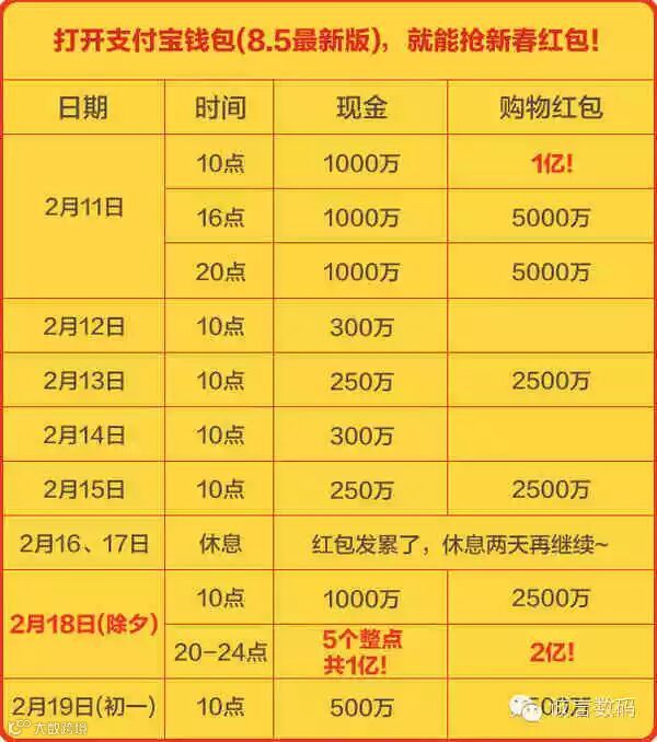 活动将于2月12日晚上21点正式开启,当晚将派送2500万个现金红包,一直延续到2月18日除夕当晚。