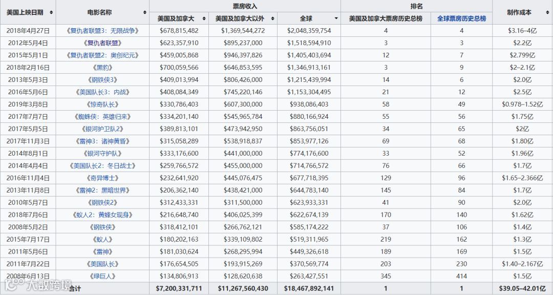 漫威电影宇宙中的电影在业界评论和商业收益两方面都获得很大的成功,十年来在全球创下超过183亿美元的票房,不仅打破无数惊人的票房纪录,超级英雄更成为全球观众近十年来的共同冒险历程。