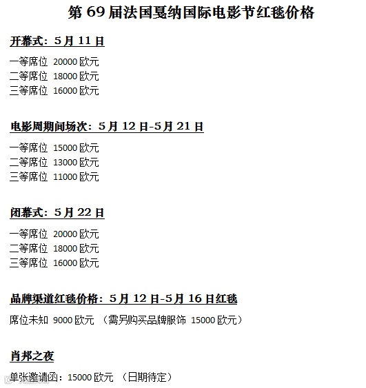 这不仅让小编想起最近网络盛传的“第69届戛纳电影节红毯价格”的截图(下图)