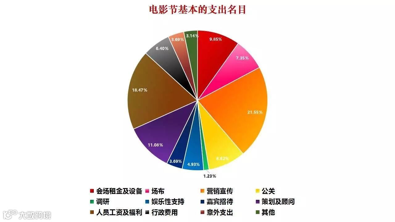 由上图可知一些电影节基本的支出名目。当然根据电影节规模的大小和不同的需求还会有其他的项目,以上内容和占比仅作参考。