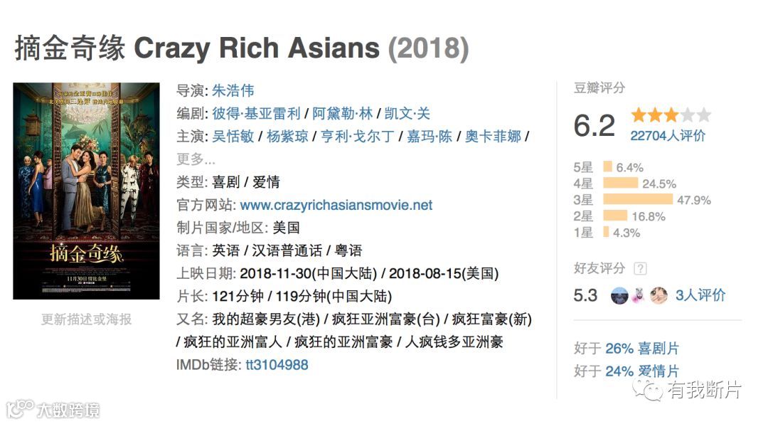 三个月前,《摘金奇缘》(“Crazy Rich Asians”又译《疯狂亚洲富豪》)风靡整个北美电影界,以三千万的成本收获了超过2亿美元的票房。