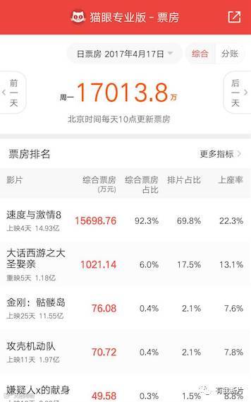 从上周五4月14号开始,中国观众就陷入了“速度与激情”的狂欢中,中国电影市场的票房也被《速度与激情8》一家独大。从《速8》上映到现在,其排片占比一直在70%左右,票房占比一直高于全国总票房的90%,就连忙碌的周一,《速8》也毫不留情地斩获了1.5亿票房,而当天全国总票房才1.7亿,其他所有在映影片的票房总和不足2000万。