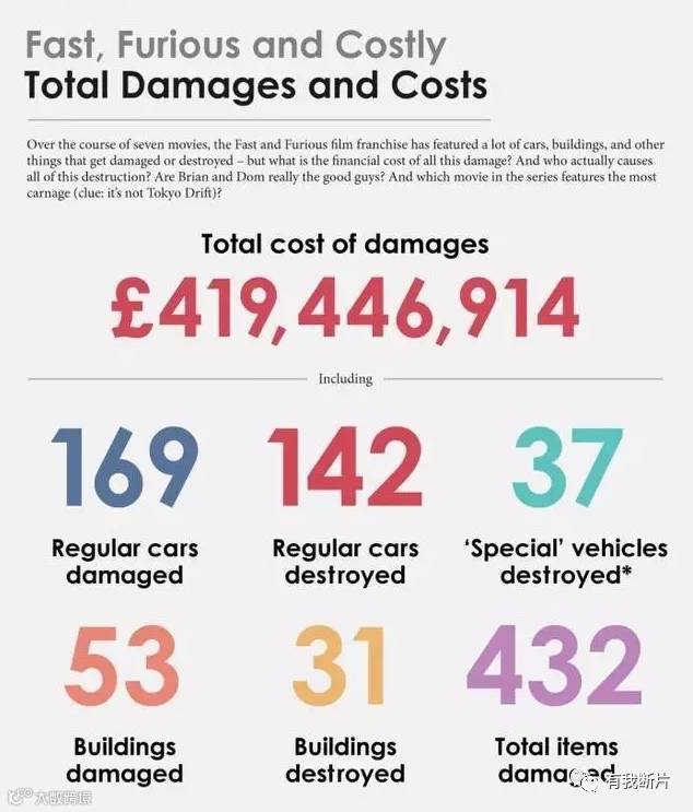 据统计,《速度与激情》系列前七部中共有169辆常规车型损坏、142辆报废、特殊车辆(含限量版)损毁37辆、建筑损坏53幢、31幢建筑被彻底摧毁,所有车辆及建筑物等损失的费用接近5亿美元。