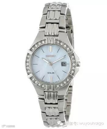 Seiko Women's SUT087 Dress Solar Sporty Crystals Japanese Quartz Watch精工光动能女士腕表,采用光动能机芯,吸收日常可见光作为能量来源,一次充满后可以使用时间长达180天。珍珠贝母表盘加上表圈上26粒水晶装饰,BOLINGBOLING很讨女孩子喜欢,不锈钢表盘和表带,表盘28mm,厚度只有7mm,轻薄小巧。强化Hardlex矿物耐磨表镜,防水30米。发货重量1磅,国内公价¥2500。