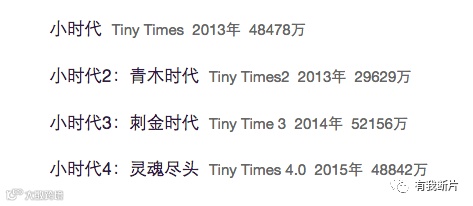 粉丝电影大都选择在暑期档上映,从2013年到2015年,《小时代》四部也都是在暑期档上映,系列票房超过18亿,其观影群体也以学生群体为主,虽然口碑烂到哭,但是也骗到了不少不谙世事的小粉丝的钱。