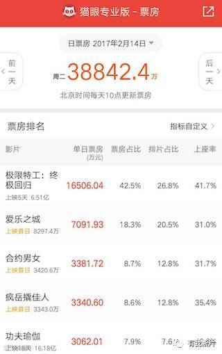 情人节上映的歌舞爱情片《爱乐之城》当天共斩获票房7091万,是2月14日当天票房亚军,只用一天就打破了歌舞片在内地的票房魔咒,比同时上映的《合约男女》和《疯岳撬家人》两部电影当日票房的总和还多。