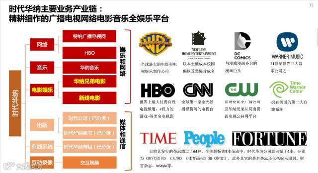 华纳兄弟娱乐公司主营业务分为四大块:电影部门、家庭娱乐、电视部门和 DC 漫画公司。华纳兄弟影业是美国成立时间第三悠久的电影公司,也是华纳兄弟娱乐公司旗下子公司。著名的作品有《蝙蝠侠》系列、《超人》系列、《黑客帝国》系列、《肖申克的救赎》、《哈利波特》系列、《指环王》系列、《霍比特人》系列、《地心引力》、《盗梦空间》。截至 2011年其出品的《哈利〃波特》系列电影在全球范围内票房收入已经超过 74 亿美元,稳居全球“最赚钱”电影系列。华纳兄弟影业正在发展以乐高大电影、DC 电影宇宙以及哈利波特系列为核心的电影制作路线。