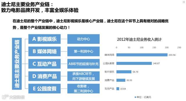 主要分为三层:第一层以影视动画为主内容制作;第二层利用自身发行品牌将产品推介出去;第三层是通过媒体网络(如 ABC、ESPN、迪士尼频道等)、主题公园、零售/线上商店等多渠道销售和宣传。2009 年后,迪士尼与 YouTube、雅虎、优酷等网站开展视频合作等业务,收购家庭网站 kaboose、社交游戏开发商 Playdom 和儿童网站“企鹅俱乐部”等网络新媒体,拓展自身的推广渠道。