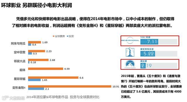 2、除此之外,环球似乎特别擅长把一些小成本的电影包装成大片。比如去年在全球拿下 4.59 亿美元的电影《超体》其实成本只有 4000 万美元。而今年情人节档上上映的看上去异常“高大上”的霸道总裁爱上我影片《五十度灰》也只有 4000 万美元,但却获得了 5.69 亿美元的全球票房。正是这些电影才是环球影业最大的依靠。