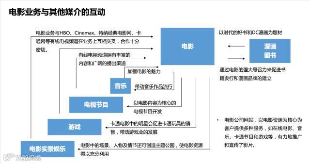 福克斯公司并不仅仅是电影制作,更拓展出许多电影营销业务,又进一步从电影业务扩展出根据电影中任务场景搭建的主题公园、电影的DVD业务、互联网业务以及相关消费产品行业。业务扩展使得企业的业务更接近于最终的电影消费者,因此是前向一体化。