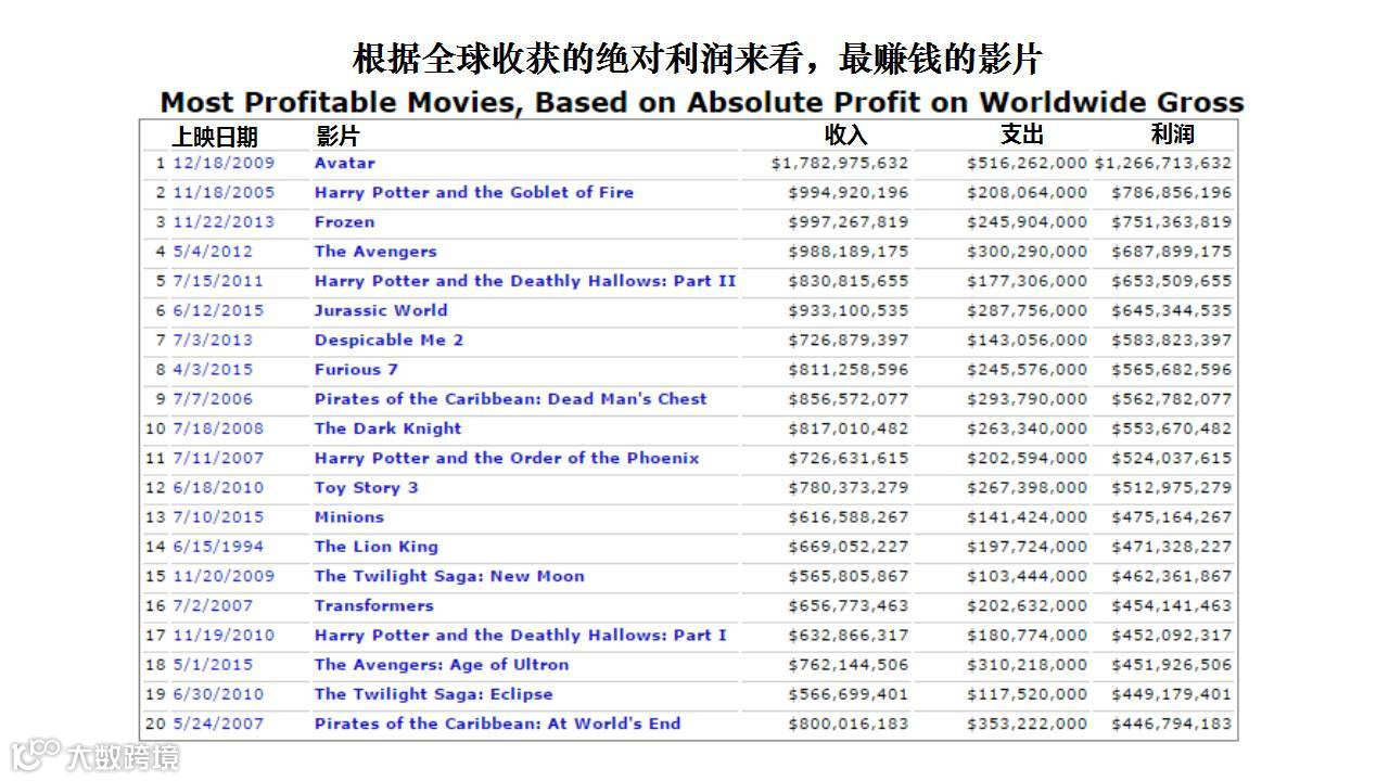 纵观当下的全球电影行业,由少数几家公司掌控着大部分的收入和市场份额已成为其显著的市场特征,有些公司甚至可以用低至6%的影片市场收回80%的利润。