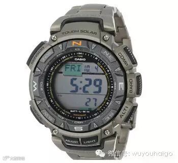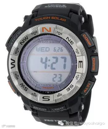 Casio Men's PRG260-1 Black Pro-Trek Watch卡西欧多功能手表,属于卡西欧PRO TREK系列,除带有CASIO当家三重感应器(数字高度计、气压计、温度计和指南针)外,还具备日出日落功能,太阳能供电无需电池,充满电最长可待机长达6个月。
