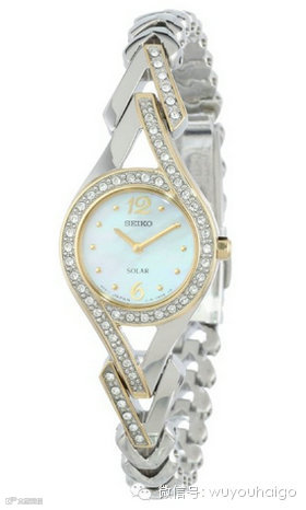 Seiko Women's SUP174 Jewelry-Solar Classic Watch精工光动能女士腕表,采用光动能机芯,吸收日常可见光作为能量来源,一次充满后可以使用时间长达180天。外观为现在女表很流行的镯式设计,珍珠贝母表盘,镀金的表壳加上表圈上亮瞎的一圈施华洛世奇水晶很讨女孩子喜欢,表盘直径只有22mm,厚度只有7mm,极致轻薄小巧。强化Hardlex表镜,防水30米。