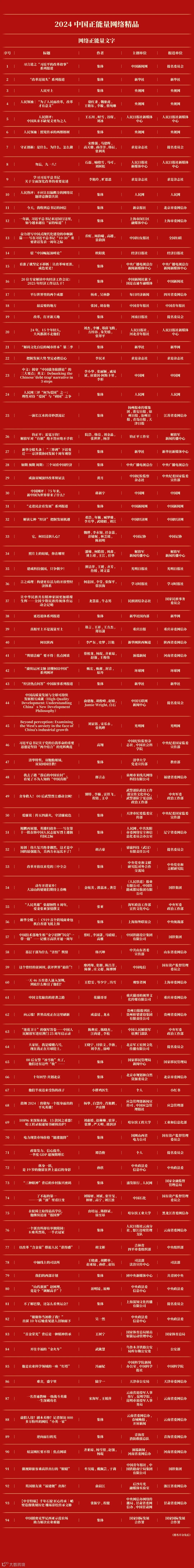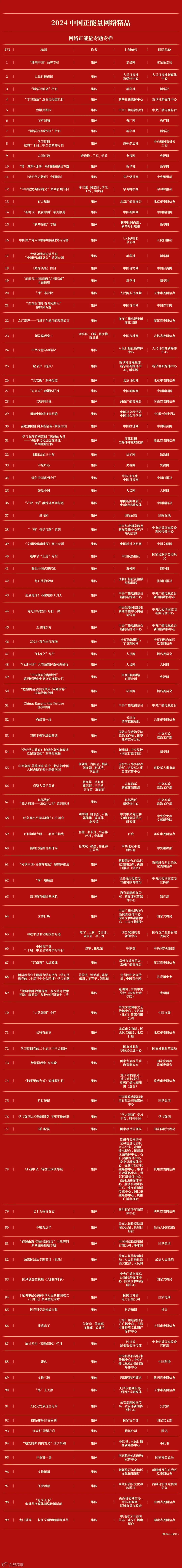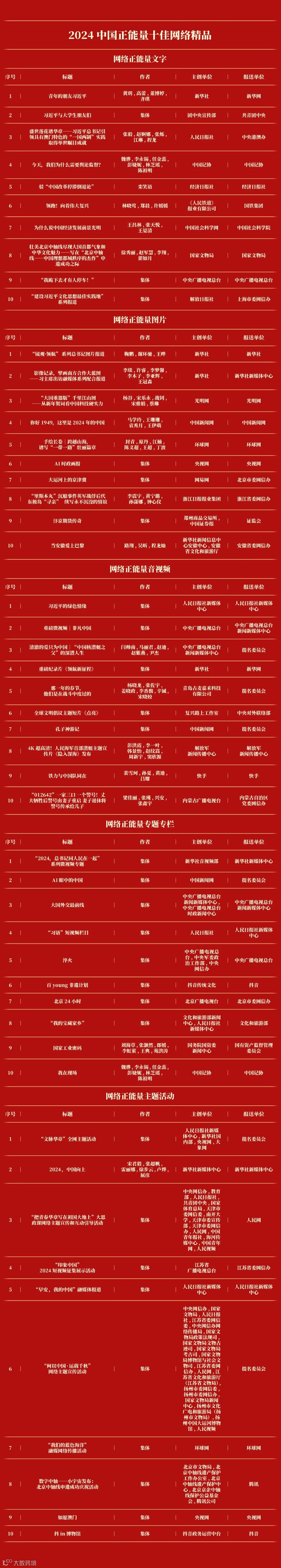 由中央网信办主办的2024中国正能量网络精品征集展播活动今天揭晓结果,经过专家审核评议、网络展播投票、评委线上打分和线下评审以及结果公示,50件十佳网络精品及499件网络精品脱颖而出,名单如下: