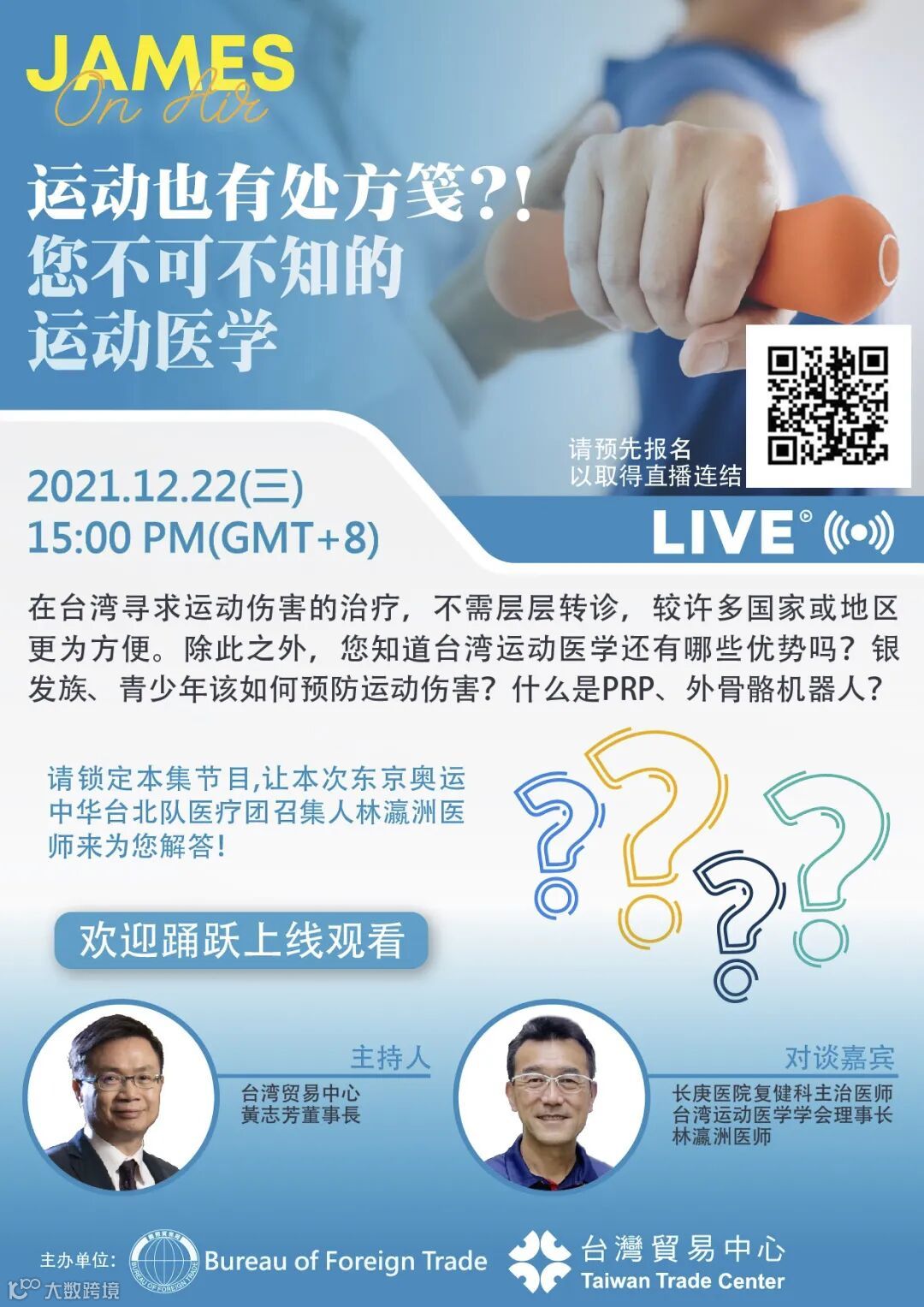 诚挚邀请大陆医疗服务相关业者、台商、运动爱好者等上线参加,欢迎在线提问。请于12月21日前扫码免费报名参会,将提供目睹平台直播链接。