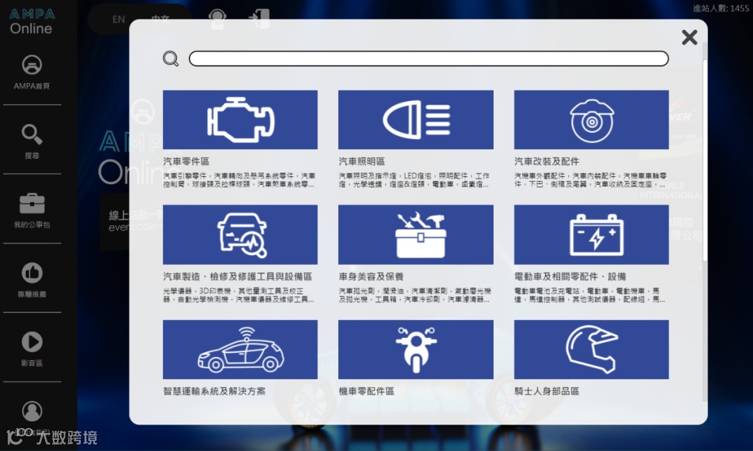 「AMPA Online」首页的便利浏览搜寻场景设计,贴心呈现13大主题产品展示分页链结,首页左侧「专属推荐」功能依据参观者有兴趣浏览产品类别,智能化客制推荐潜力参展商企业与产品,贴近参观买主需求。