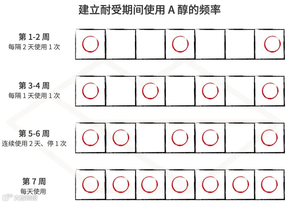首先新手确实只能用0.3%浓度以下,坚持使用0.1%就有不错的效果。但因为刺激性比较大:泛红、脱皮等。当建立耐受后,可以提高浓度,达到更佳的效果。