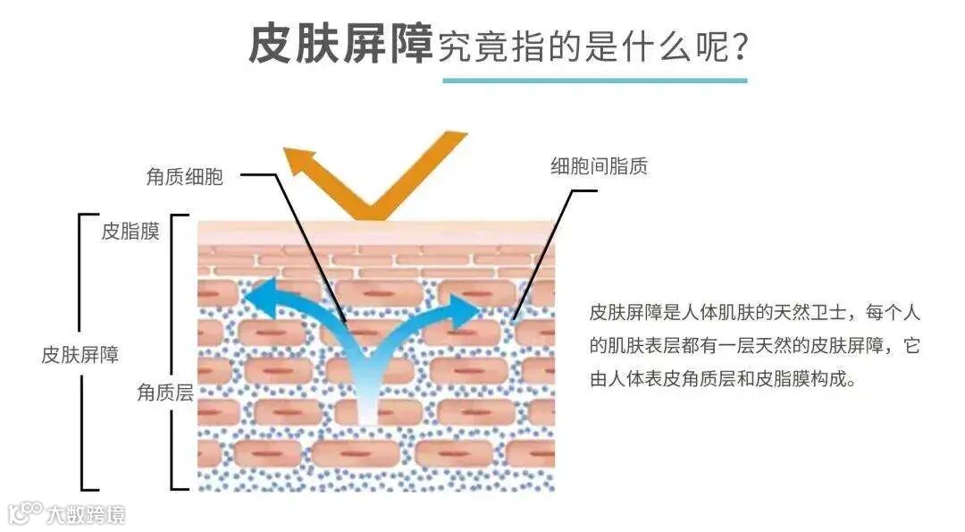 肌肤表面的皮脂膜、角质层、角质层细胞间的脂质(神经酰胺、不饱和脂肪酸、胆固醇)组成