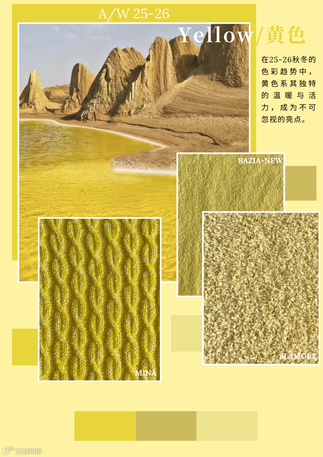 传统上,黄色在秋冬季并不占主导地位,因为人们往往倾向于选择更加沉稳、温暖的色彩,如棕色、红色或绿色。然而,在25-26秋冬,黄色系色彩开始崭露头角,从边缘走向焦点。设计师们开始大胆地将黄色融入秋冬系列中,无论是作为主色调还是点缀色,黄色都展现出前所未有的存在感。