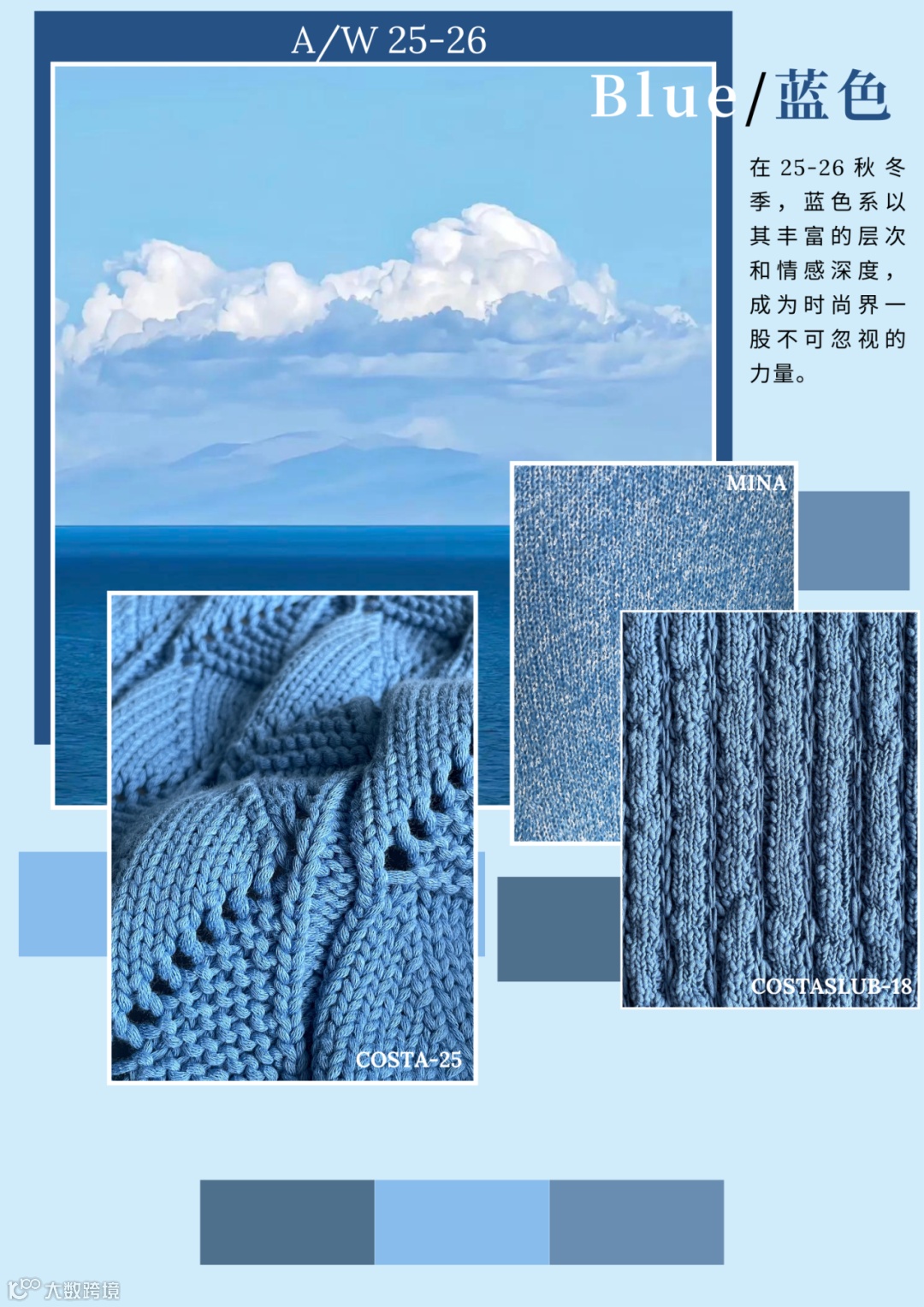 蓝色,自古以来便是海洋和天空的色彩,象征着宁静、深度与广阔。而在25-26的秋冬季,蓝色系色彩以其丰富的层次和广泛的应用,再次成为时尚界瞩目的焦点。从深海蓝的神秘到天空蓝的清新,每一种蓝色都承载着不同的情感和故事。