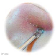 Step4:黑头、粉刺问题比较严重的MM可以选择使用粉刺针将粉刺、黑头部位轻轻按压。千万不要用苍蝇贴或是强力鼻头贴,那些产品容易造成毛孔粗大!同时需要注意的是:粉刺针使用前一定要经过消毒。不然,造成了二次感染可就不好了。