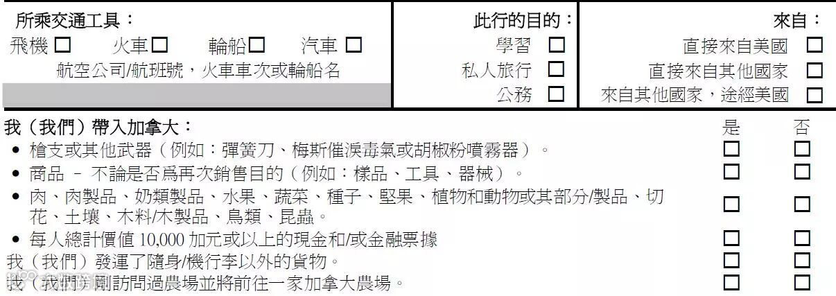飞机上,空姐会发放“加拿大入境申报单”,填写时以家庭为单位,同一张表上最多可填4位家庭成员。如果一个人旅行,则单独填写一张。填写须用英文或法语,为便于理解,我们配上了重要部分的相应中文翻译。填好后,和护照放在一起,入关时需要拿出来的。