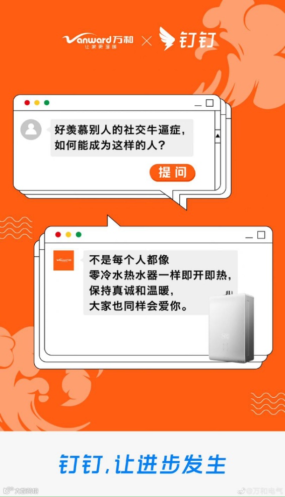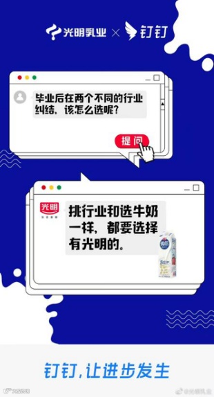将SLOGAN升级为“钉钉,让进步发生”之后,钉钉与各大品牌发起联动,发布微博“今天有个好朋友@钉钉,他向我提出一个问题并邀请我为他的梦想助力”,以各大品牌特性回答各种关于“进步”的问题。
