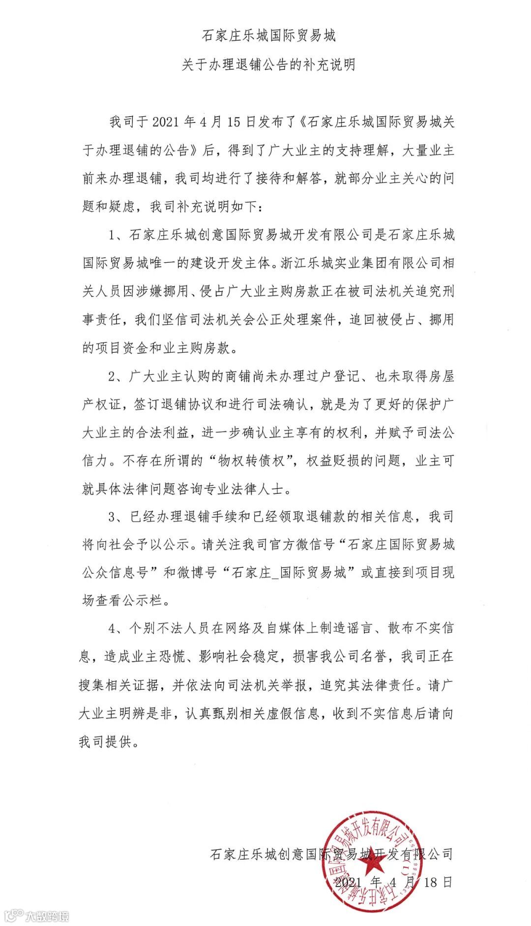 我司于2021年4月15日发布了《石家庄乐城国际贸易城关于办理退铺的公告》后,得到了广大业主的支持理解,大量业主前来办理退铺,我司均进行了接待和解答,就部分业主关心的问题和疑虑,我司补充说明如下: