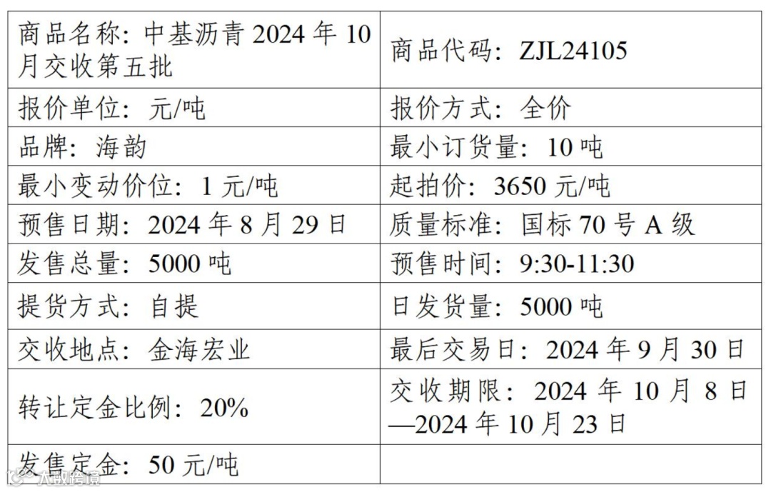 集团股份有限公司定于2024年8月29日在产能预售系统中发售2024年10月交收第五批沥青产品,具体信息如下: