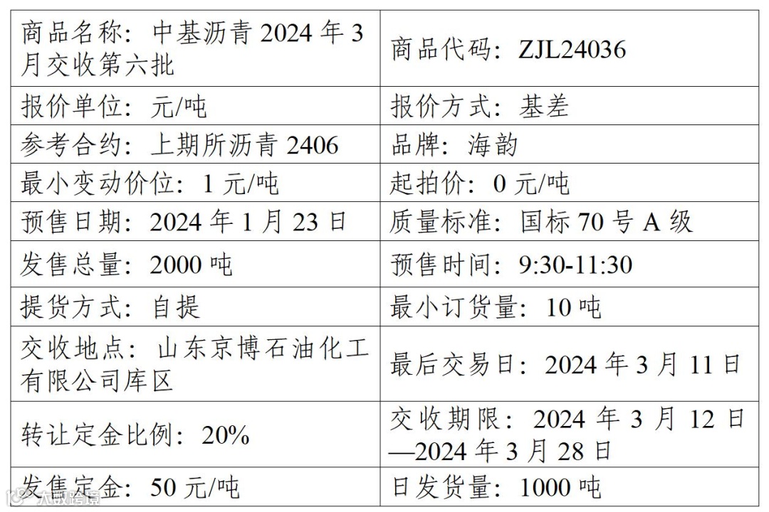 集团股份有限公司定于2024年1月23日在产能预售系统中发售2024年3月交收第六批沥青产品,具体信息如下: