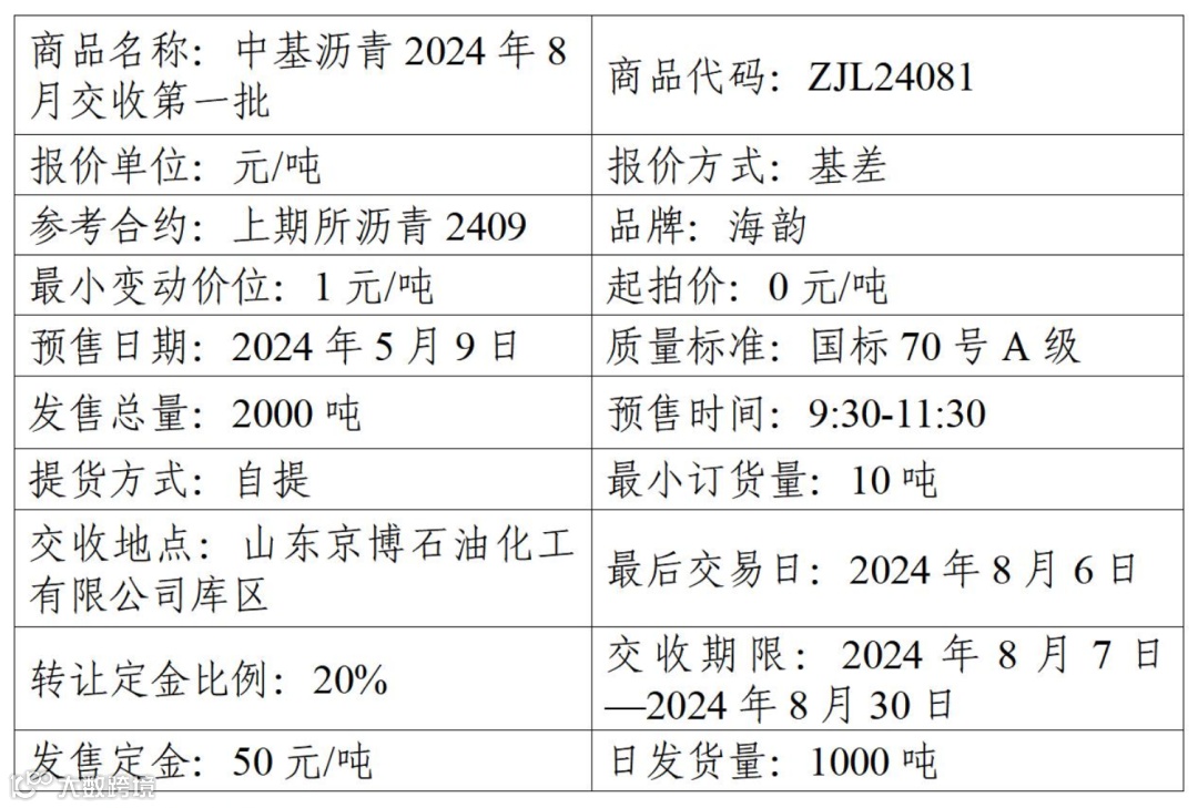 集团股份有限公司定于2024年5月9日在产能预售系统中发售2024年8月交收第一批沥青产品,具体信息如下: