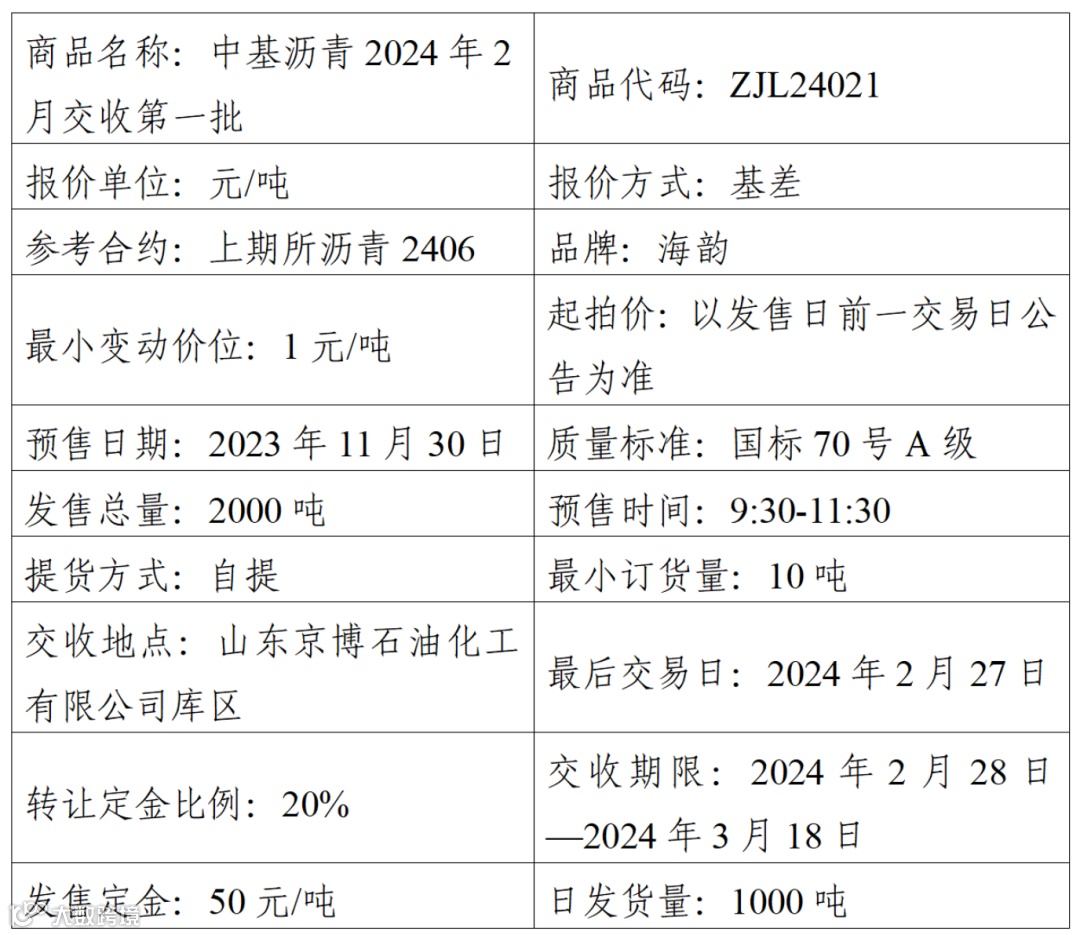 集团股份有限公司定于2023年11月30日在产能预售系统中发售2024年2月交收第一批沥青产品,具体信息如下: