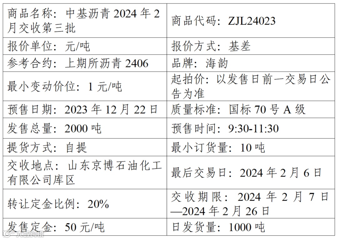 集团股份有限公司定于2023年12月22日在产能预售系统中发售2024年2月交收第三批沥青产品,具体信息如下: