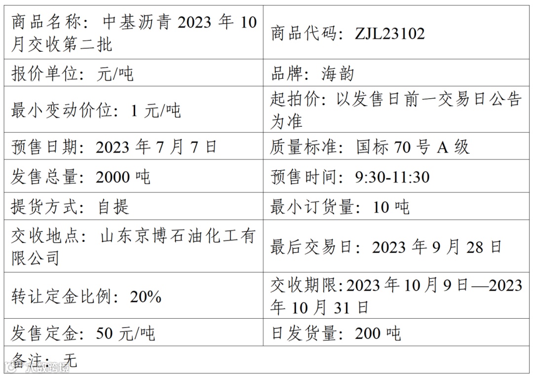 中基宁波集团股份有限公司定于2023年7月7日在产能预售系统中发售2023年10月交收第二批沥青产品,具体信息如下: