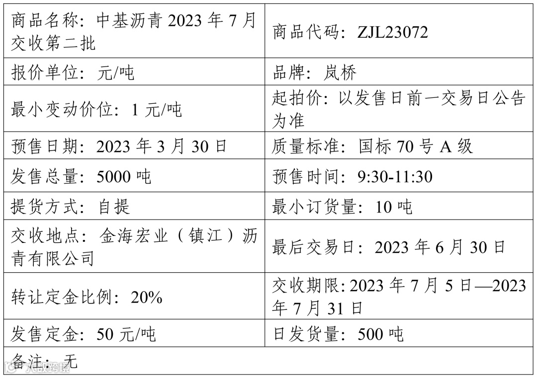 集团股份有限公司定于2023年3月30日在产能预售系统中发售2023年7月交收第二批沥青产品,具体信息如下: