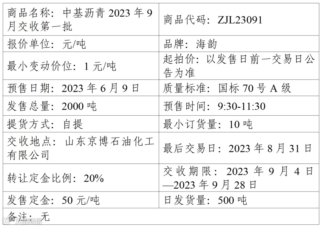 中基宁波集团股份有限公司定于2023年6月9日在产能预售系统中发售2023年9月交收第一批沥青产品,具体信息如下: