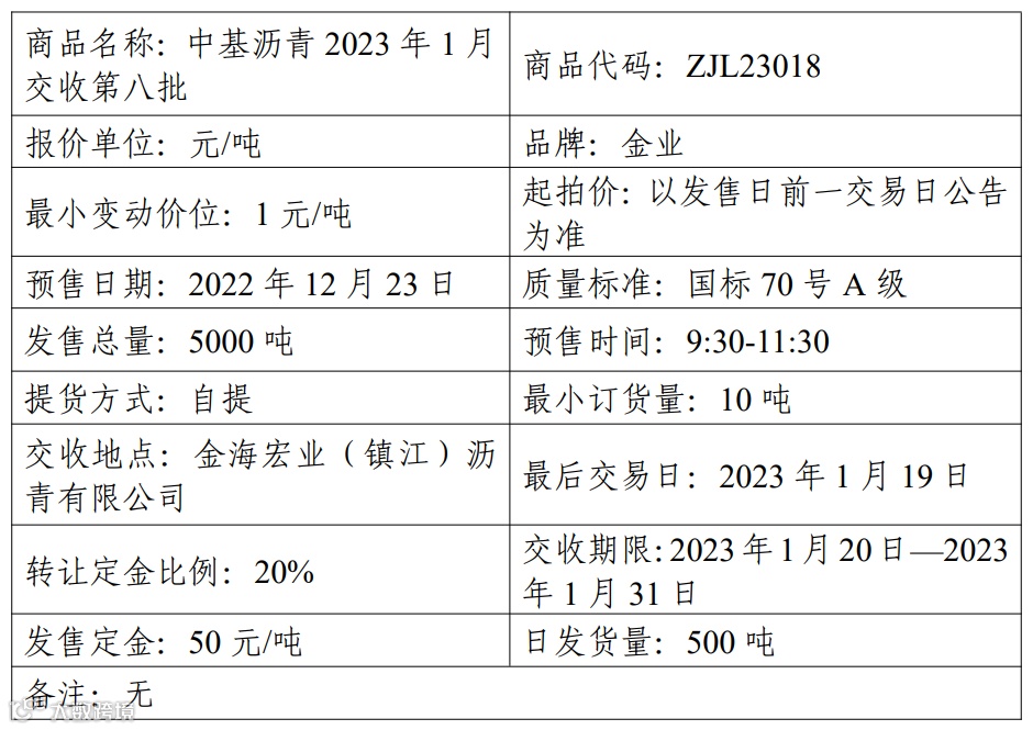 中基宁波集团股份有限公司定于2022年12月23日在产能预售系统中发售2023年1月交收第八批沥青产品,具体信息如下: