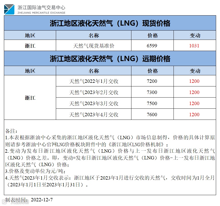 【价格指数】浙江地区液化天然气(LNG)价格(20221207)