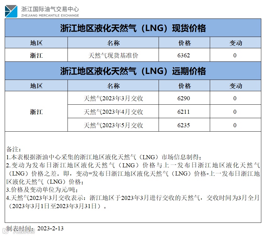 【价格指数】浙江地区液化天然气(LNG)价格(20230213)