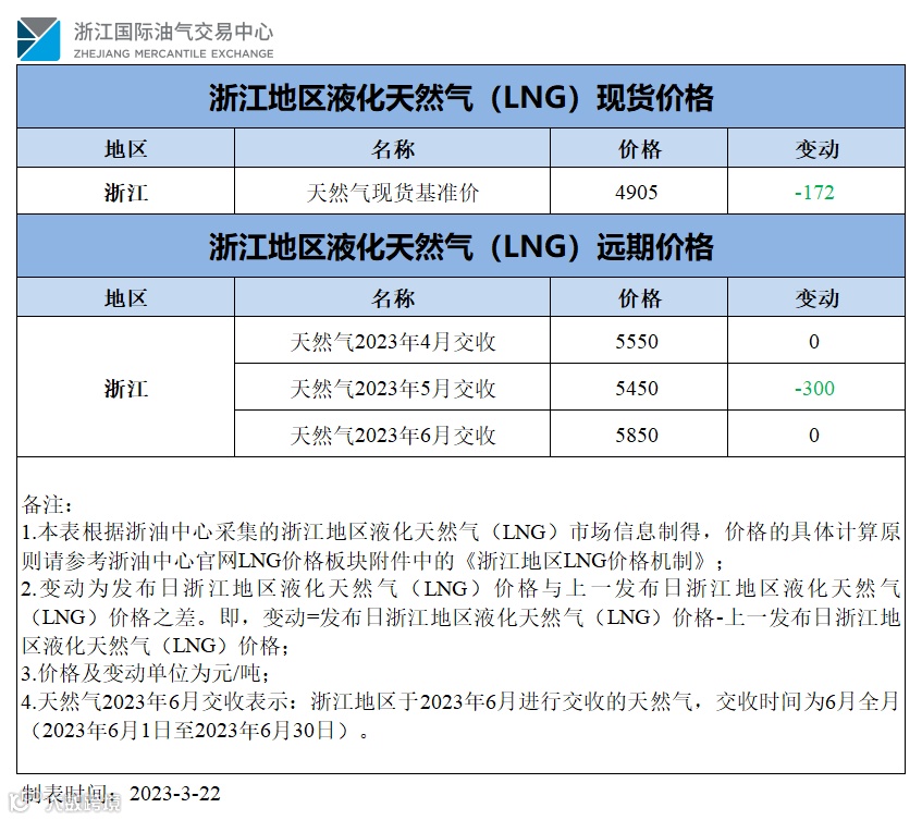 【价格指数】浙江地区液化天然气(LNG)价格(20230322)