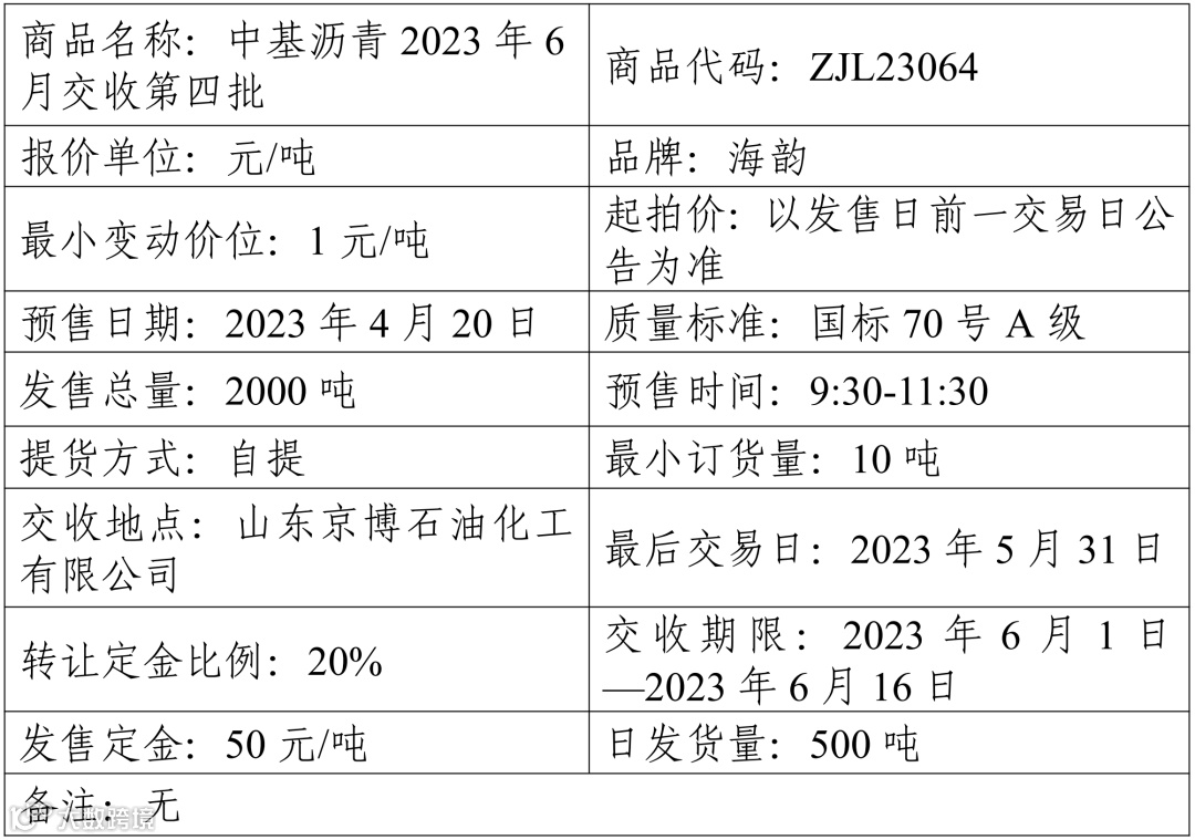 集团股份有限公司定于2023年4月20日在产能预售系统中发售2023年6月交收第四批沥青产品,具体信息如下: