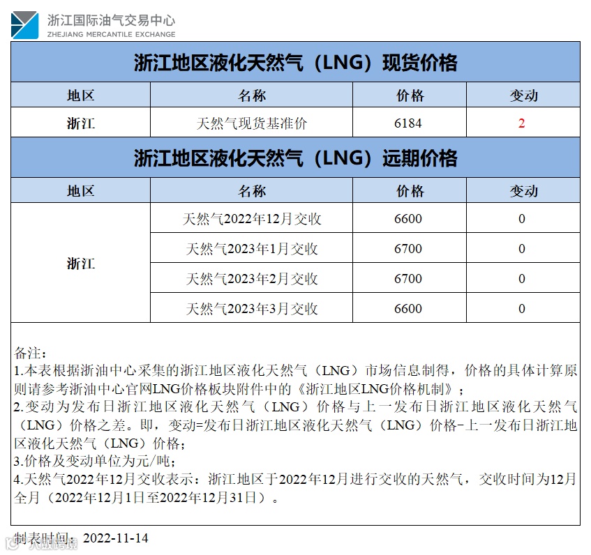 【价格指数】浙江地区液化天然气(LNG)价格(20221112)
