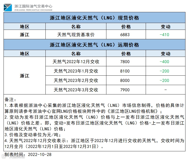 【价格指数】浙江地区液化天然气(LNG)价格(20221028)