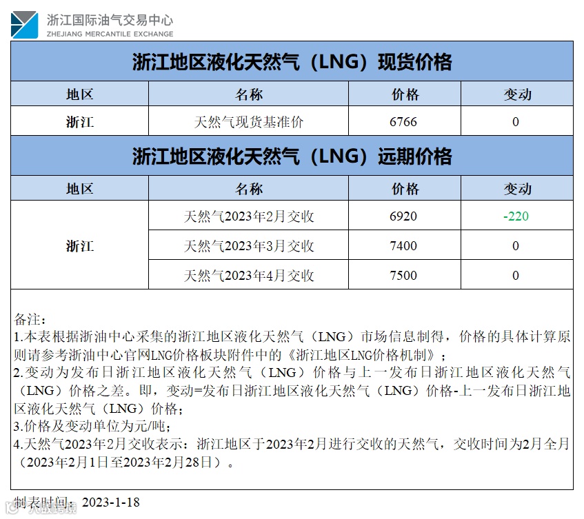 【价格指数】浙江地区液化天然气(LNG)价格(20230118)