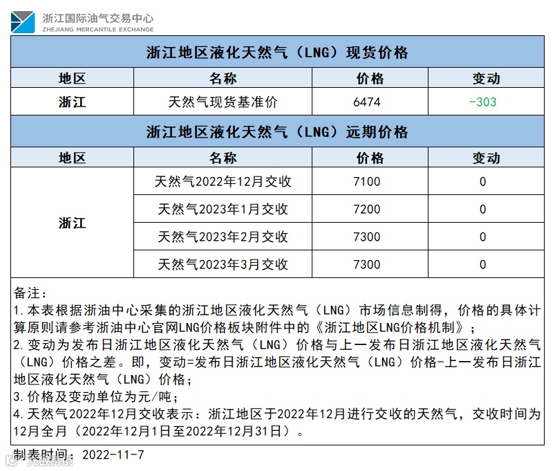 【价格指数】浙江地区液化天然气(LNG)价格(20221105)