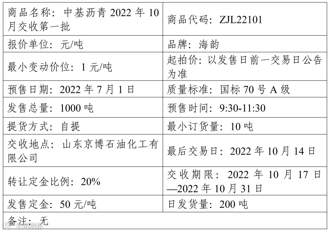 中基宁波集团股份有限公司定于2022年7月1日在产能预售系统中发售2022年10月交收第一批沥青产品,具体信息如下:
