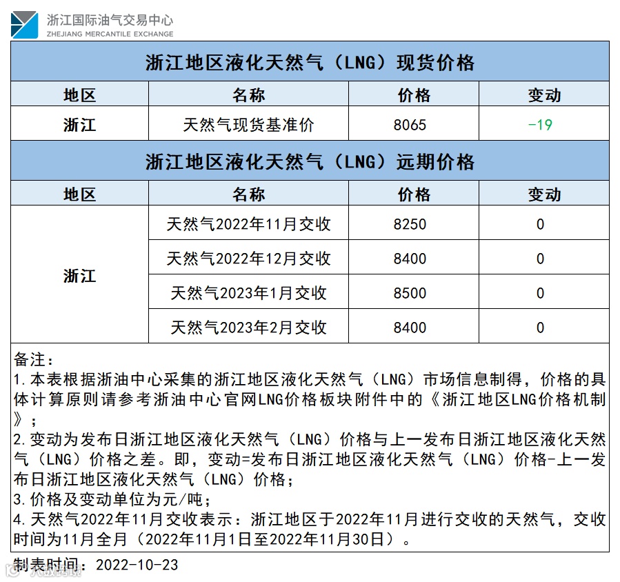 【价格指数】浙江地区液化天然气(LNG)价格(20221023)