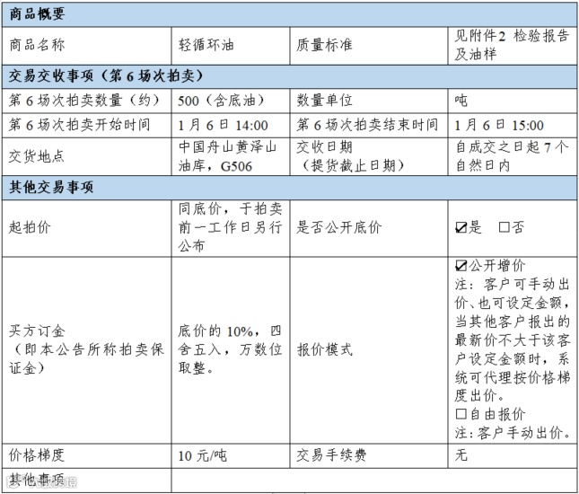 受有关部门委托,浙江国际油气交易中心有限公司(简称“浙油中心”)将于2022年1月6日通过交易系统公开拍卖轻循环油。现将有关的拍卖事宜告知如下: