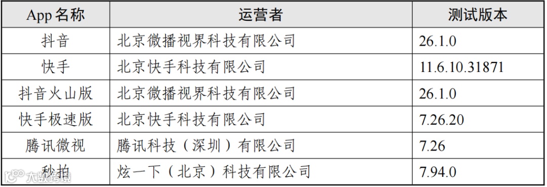 本次测试选取了19家应用商店⁽¹⁾累计下载量达到1亿次的“短视频类”App,共计6款,其基本情况如表1。