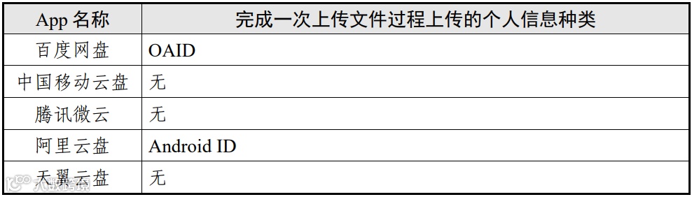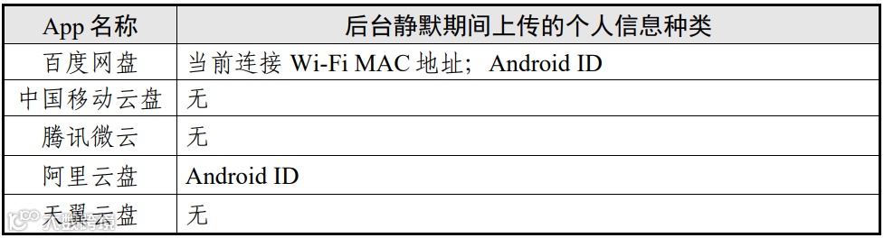 (4)在后台静默场景中,个人信息上传种类最多的为百度网盘(2类)。具体情况如表9。